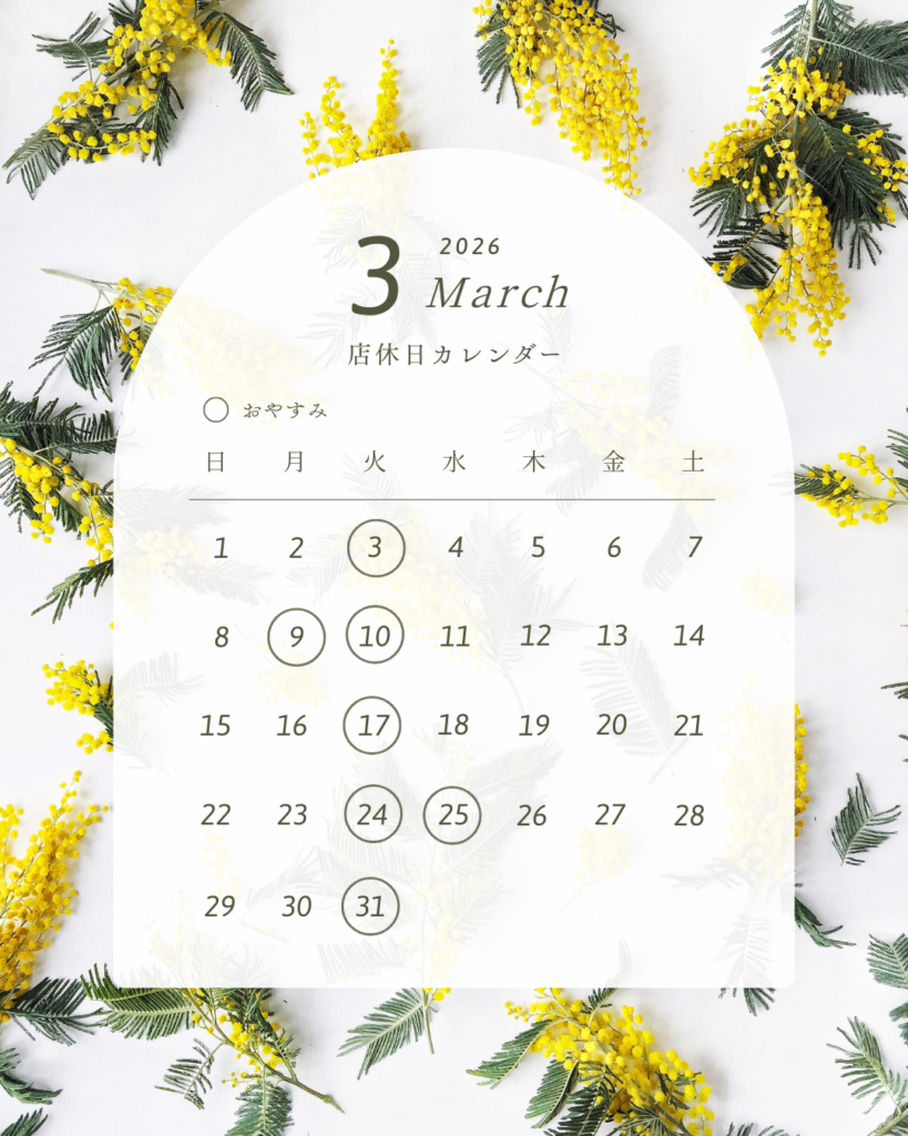 3月のお休みは毎週火曜日、9日(月)、25日(水)となっております。